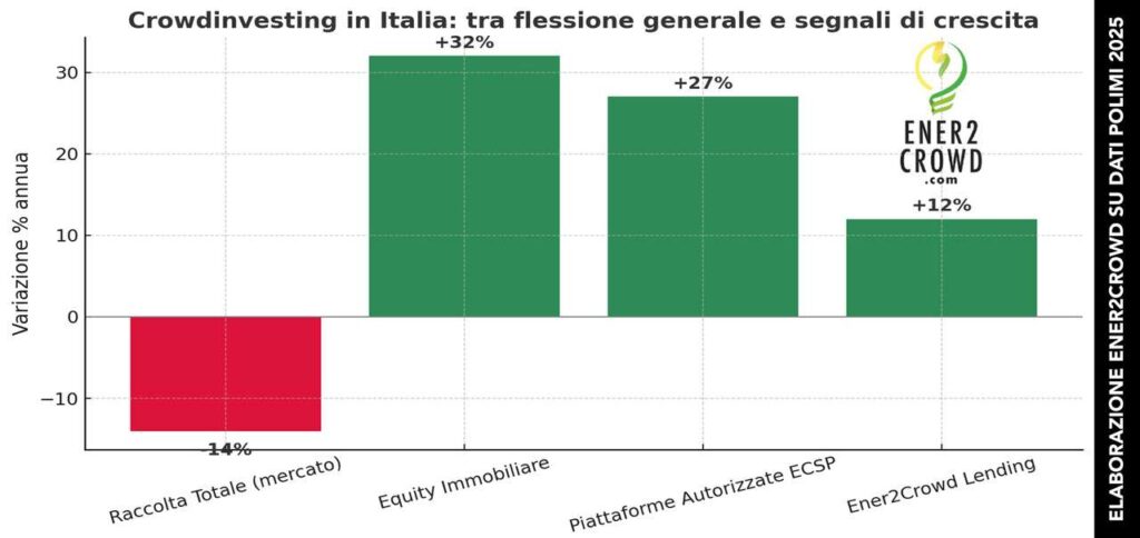 Ener2Crowd, la piattaforma ed app numero uno in Italia per gli investimenti ESGconferma l’accuratezza delle rilevazioni del Politecnico di Milano (Polimi), ma offre una chiave di lettura differente, che evidenzia come dietro questo dato complessivo si nascondano segnali concreti di resilienza e di crescita.