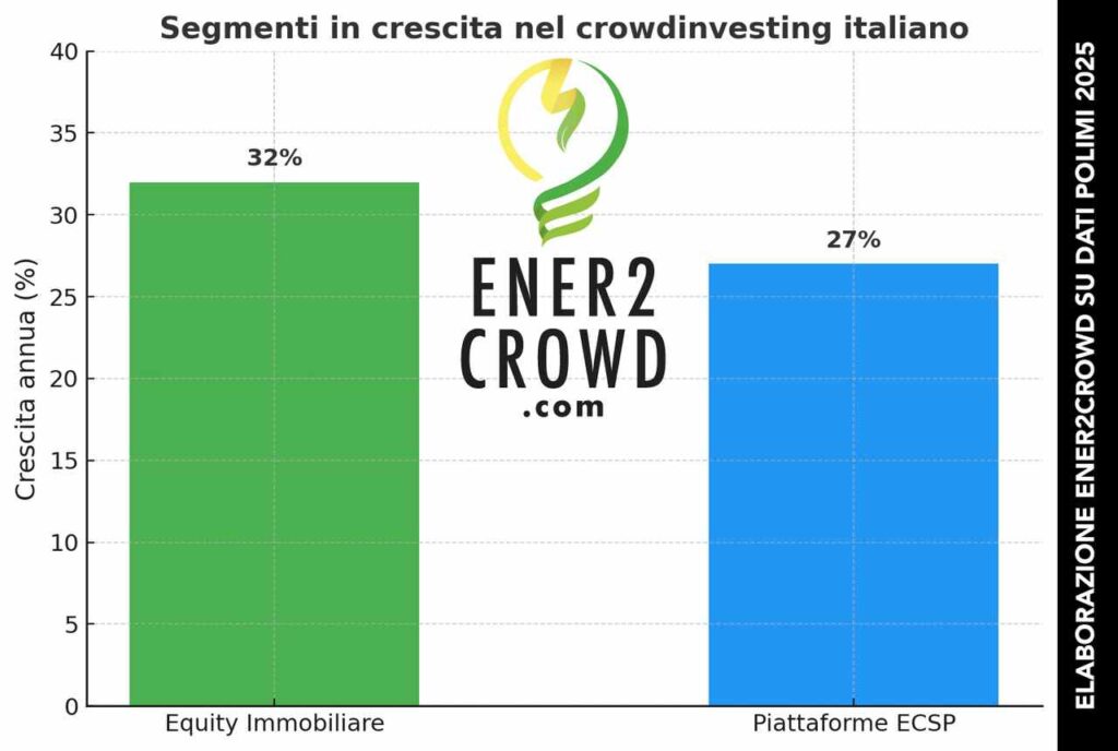 3) Equity immobiliare anch’esso in accelerazione. Con 63,77 milioni di euro raccolti, l’equity crowdfunding immobiliare cresce del 32% anno su anno, dimostrando che gli investitori restano attratti da progetti tangibili e a basso rischio percepito.