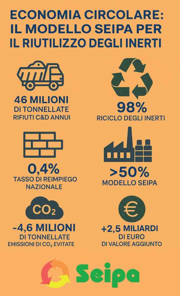 Roma, 7 ottobre 2025 – Nel settore delle costruzioni, dove il 98% dei rifiuti inerti viene già avviato a riciclo ma solo lo 0,4% viene effettivamente reimpiegato nei cantieri, il Gruppo Seipa dimostra che la transizione è possibile: nei propri impianti il tasso di sostituzione è del 52%, un risultato oltre 120 volte superiore alla media nazionale e in linea con gli obiettivi del PNRR e della Commissione Europea.