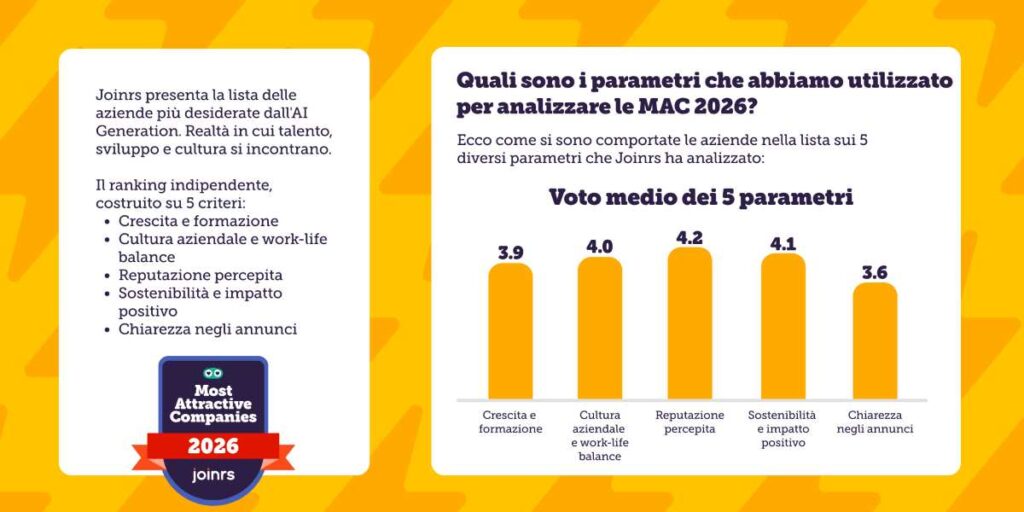 Milano, 16 febbraio 2026 – Joinrs, la piattaforma di recruiting di riferimento per le aziende in cerca di talenti della Gen Z, presenta le Most Attractive Companies Italia 2026, la lista delle medio-grandi aziende più desiderate dall’«AI Generation», la generazione che ha integrato l’intelligenza artificiale nella propria quotidianità. L’elenco, indipendente e data-driven, nasce dall’analisi dei comportamenti delle aziende ed è validato dal Joinrs Data Loop, l’osservatorio annuale dedicato all’analisi delle tendenze e delle preferenze della community.